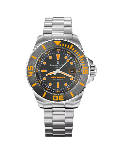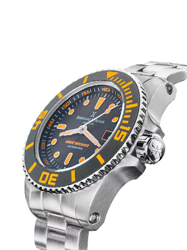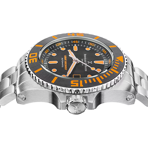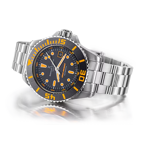 | Boîtier et couronne | Acier inoxydable 316L brossé/poli avec lunette en céramique noire et index lumineux orange, couronne vissée et valve à hélium auto-activable |
