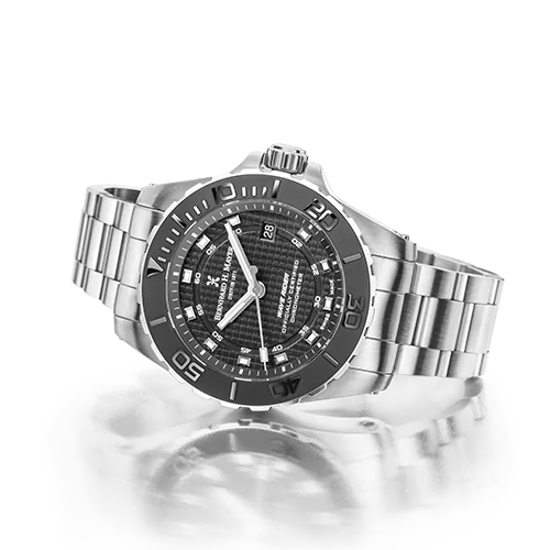 | Cadran | Cadran à motif maillé noir avec index Super-LumiNova blancs et imprimé « Officially Certified Chronometer » |